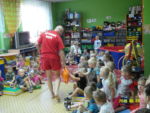 Mieliśmy okazję zaprosić do naszego przedszkola ratownika WOPR-u Kościan pana Jarosława Smoczyka. Ratownik szczegółowo przedstawił dzieciom jak powinniśmy reagować podczas sytuacji zagrożenia zdrowia i życia. Kolejny raz wychowankowie przedszkola zostali uwrażliwieni na numery alarmowe oraz na konieczność udzielenia pomocy osobie poszkodowanej. Wiedza i świadomość pozyskana podczas wczesnej edukacja w zakresie bezpieczeństwa i pierwszej pomocy pozwali uniknąć wiele wypadków i zdarzeń, a dodatkowo kształtuje właściwe postawy i zachowania podczas sytuacji zagrożenia życia. Profesjonalna postawa ratownika sprawiła, że wszystkie dzieci i pracownicy z uwagą i w ogromnym skupieniu przysłuchiwali się prelekcji. Mamy nadzieję, że wiedza nabyta przez naszych wychowanków sprawi, że dojrzale i świadomie będą unikać sytuacji zagrażających zdrowiu i życiu szczególnie podczas wakacji.