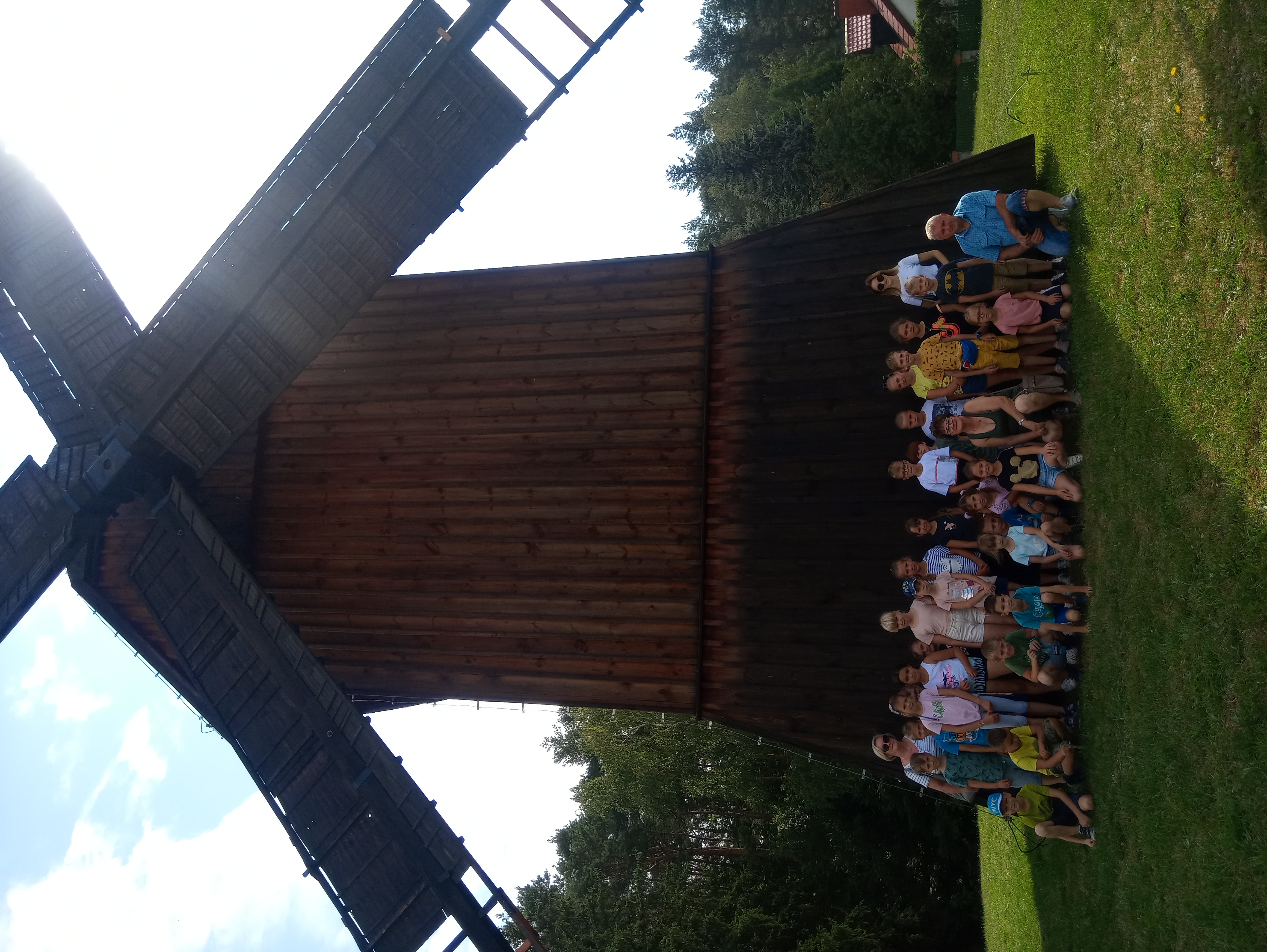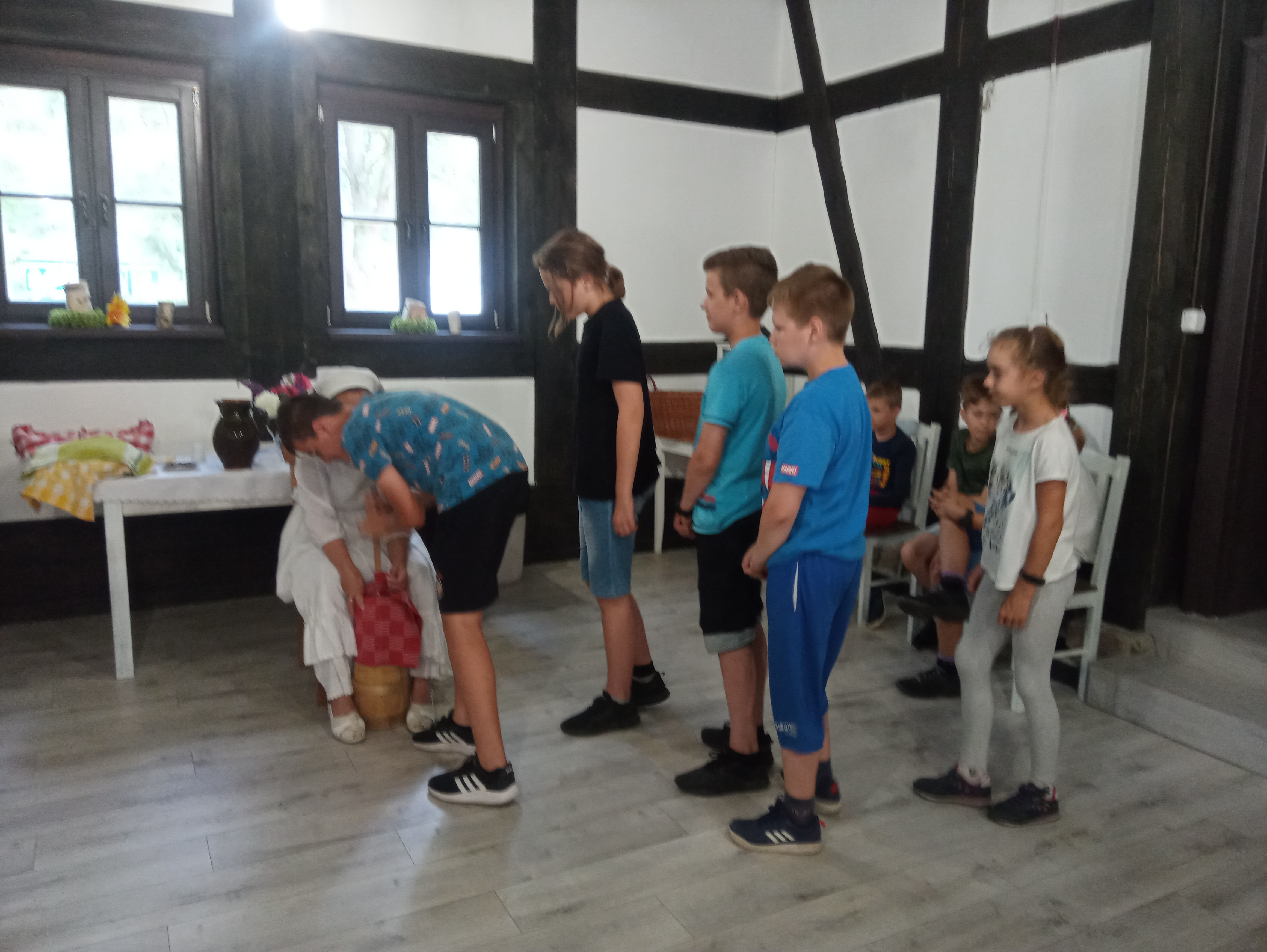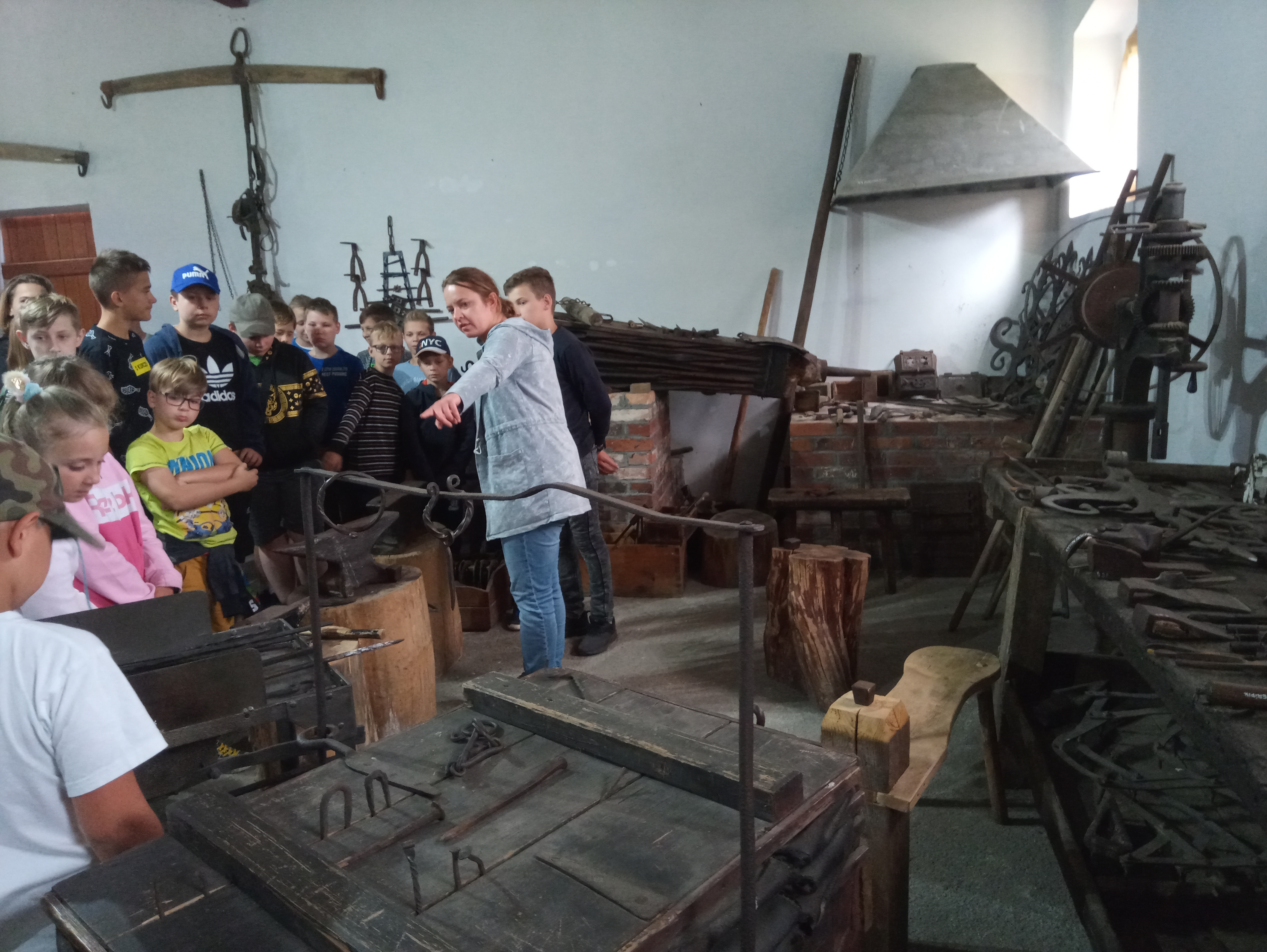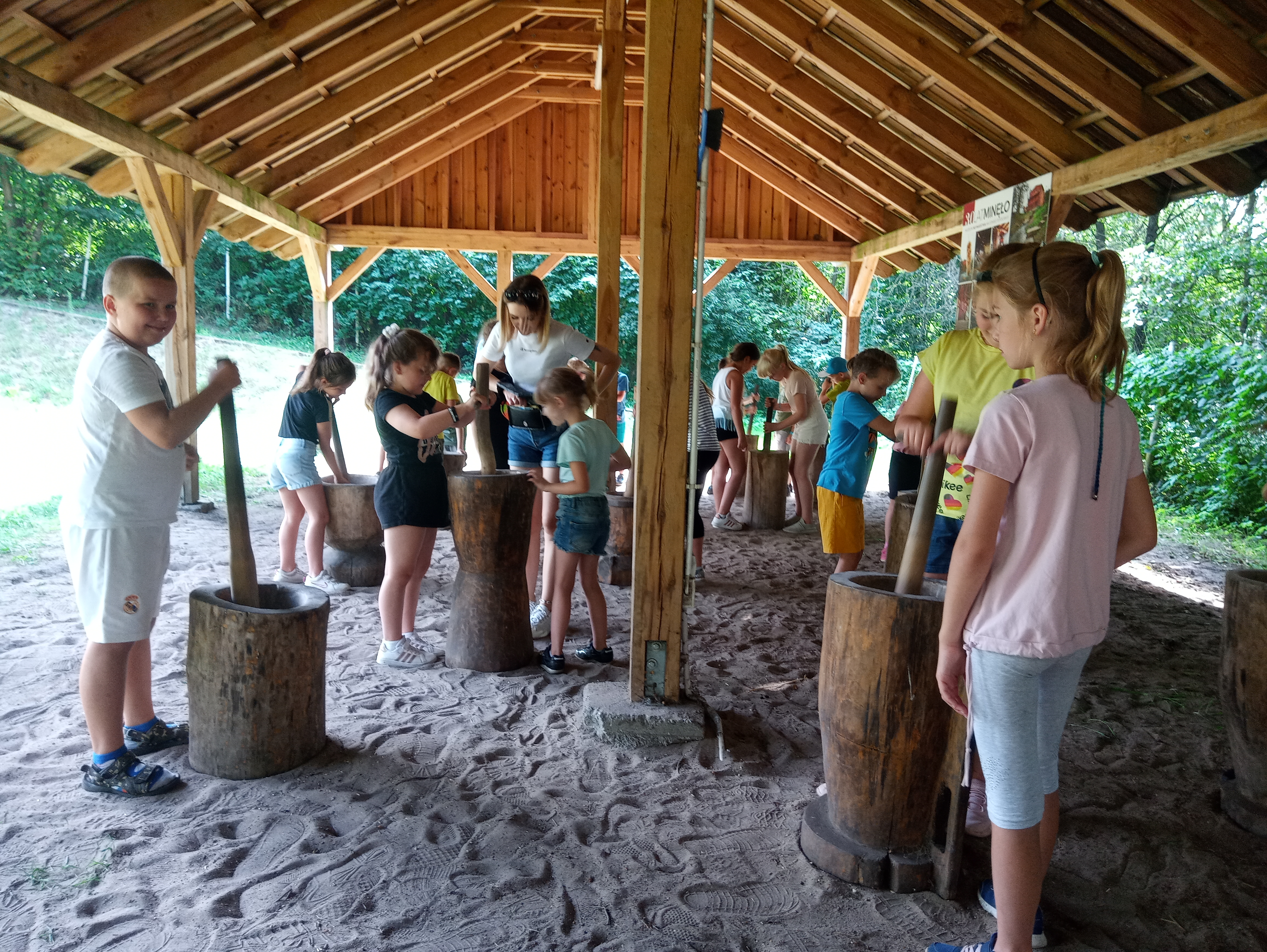 Podczas półkolonii letniej zorganizowanej przez Szkołę Podstawową w Mochach dzieci i młodzież zrealizowały projekt pt. ”Poznajemy ginące zawody”. Wypoczynek trwał od 19-30 lipca 2021r.Uczestnicy zwiedzili wiele ciekawych miejsc i brali udział w warsztatach edukacyjnych, które pozwoliły im lepiej poznać tzw. ginące zawody. W Centrum Edukacji Regionalnej i Przyrodniczej w Mniszkach poznali miejsca pracy oraz narzędzia, których używali kowal, bednarz, kołodziej, szewc, fotograf,rybak,pszczelarz,praczka,zegarmistrz,krawiec,fryzjer,drukarz. Tam obejrzeli też wyposażenie dawnej klasy szkolnej i składu kolonialnego. Mogli spróbować pisania gęsim piórem, pobierając atrament z kałamarza. W Centrum również brali udział w warsztatach stolarskich, podczas których wykonali „ryczkę’’.Każdy swój stołek mógł zabrać do domu. W Nowym Tomyślu poznali zawód wikliniarza i plecionkarza. Z dużym zaciekawieniem obejrzeli pokaz gotowania, parzenia i korowania wikliny. Każde chętne dziecko mogło własnoręcznie okorować wiklinową witkę. Po zwiedzeniu Muzeum Wikliniarstwa był spacer w mini zoo, a następnie czas na lody. Kolejny zawód, który nas interesował to młynarz, aby obejrzeć młyn wodny i wiatraki półkoloniści udali się w daleką podróż, bo aż do Muzeum Młynarstwa w Jaraczu. Tam zwiedzili stary wiatrak oraz młyn wodny z pełnym wyposażeniem. Po zwiedzaniu brali udział w warsztatach ręcznego mielenia ziarna na mąkę i przesiewania mąki. Uczestnicy wypoczynku stwierdzili, że to była trudna praca. Z Jaracza udali się do Klotyldzina, gdzie jest gospodarstwo agroturystyczne ”Alpakoland” , gdzie dowiedzieli się o hodowli alpak, których tam było ok.60, poznali ich upodobania, a nawet mogli pójść z alpaką na smyczy na spacer. Kto chciał mógł udać się na przejażdżkę konną. W Muzeum Etnograficznym w Ochli uczestnicy obejrzeli wyposażenie chat wiejskich, zobaczyli budynki gospodarcze kryte strzechą, poznali dawne maszyny rolnicze oraz wzięli udział w warsztatach obróbki śmietany, podczas których wytworzyli masło i maślankę. Następnie zjedli pajdę chleba i popili maślanką.