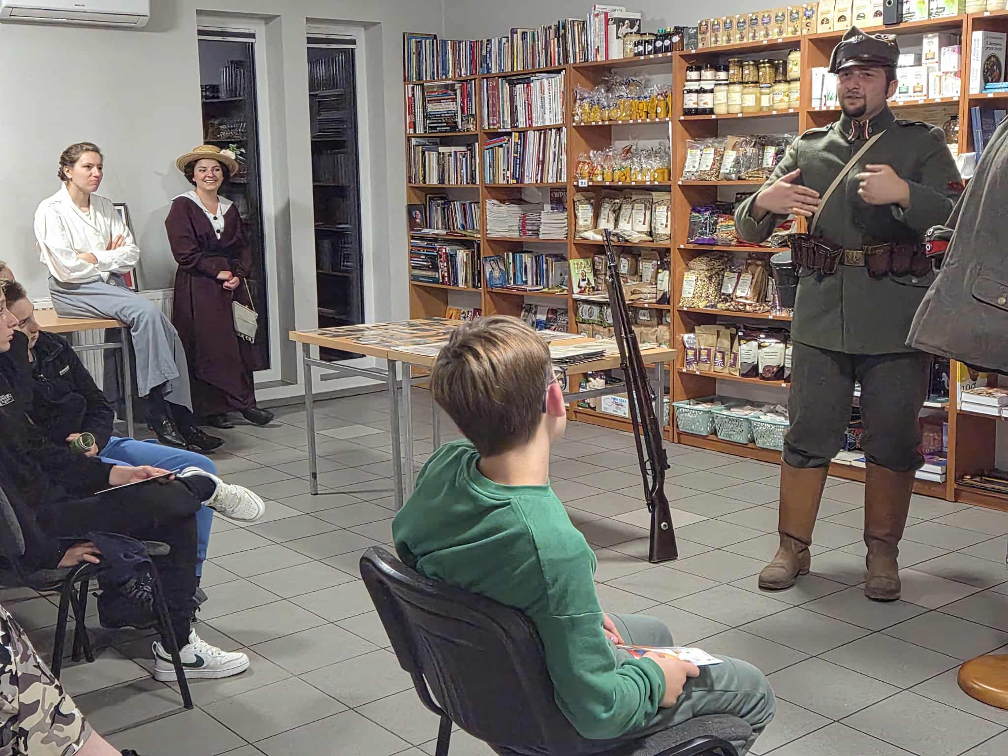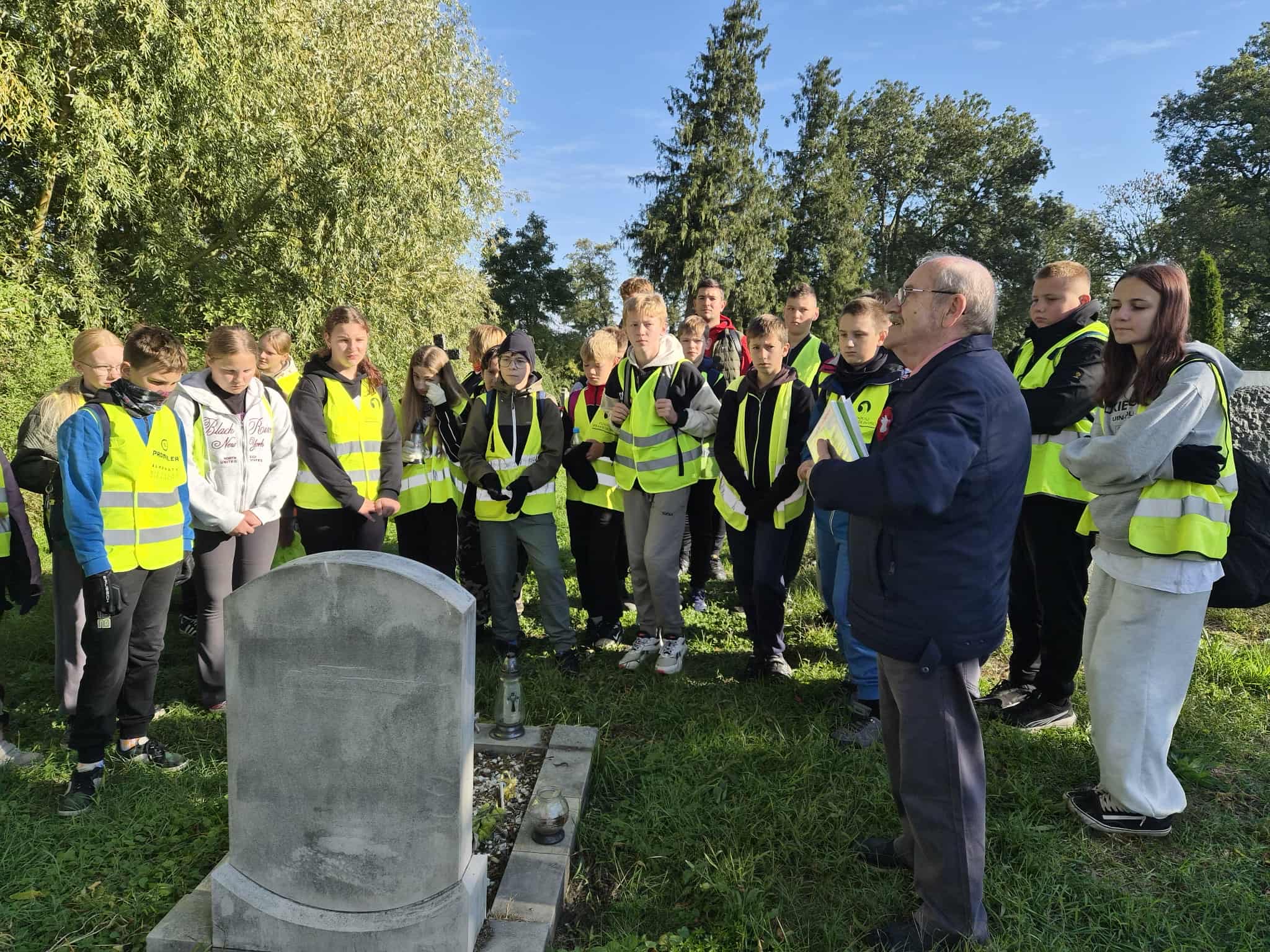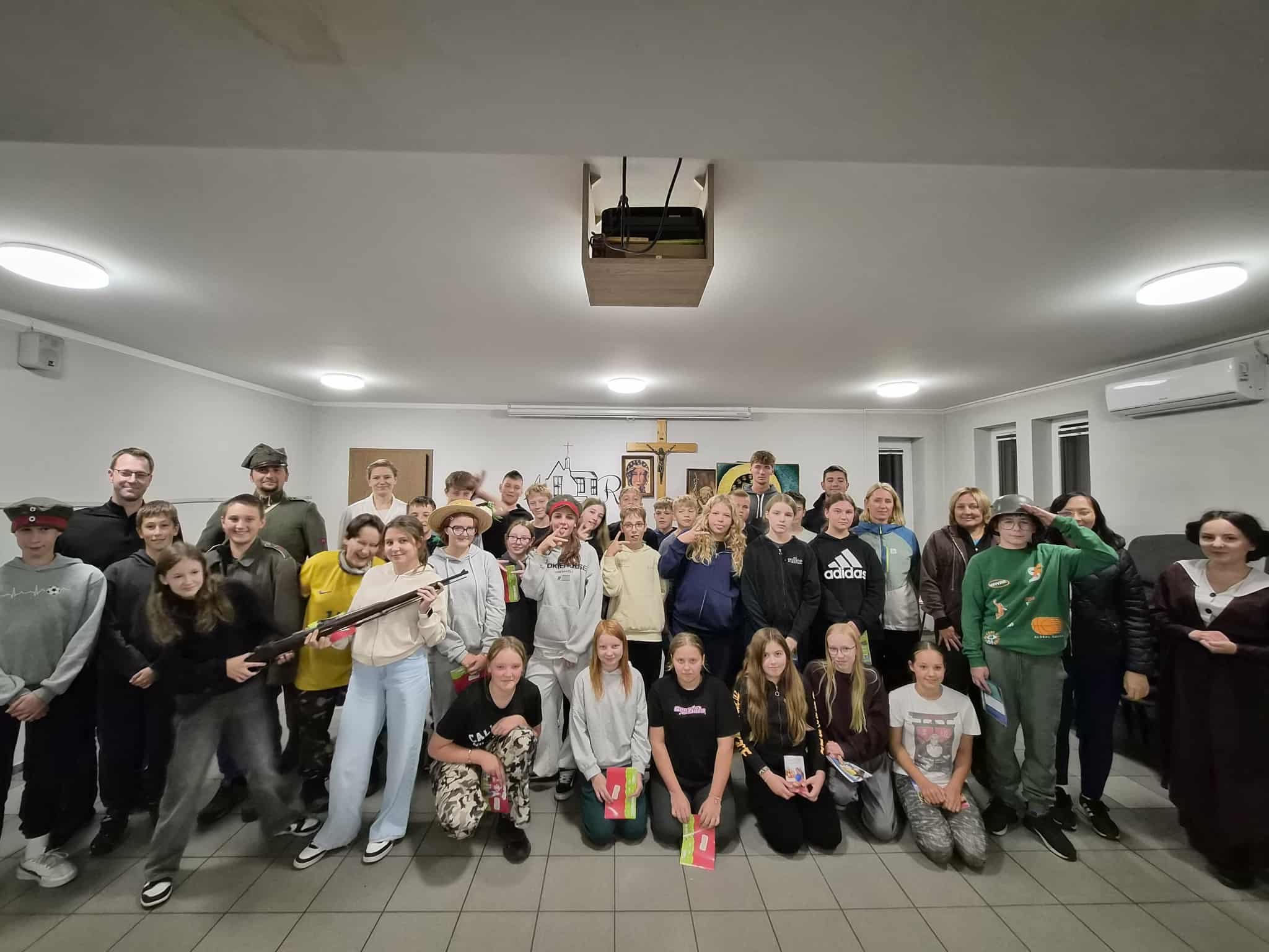 Kolejnym etapem było Zbarzewo, miejsce zwycięskiej potyczki Kompanii Przemęckiej z niemieckim oddziałem straży granicznej. Przy znajdującym się tam pomniku uczestnicy zapalili znicz i uczcili pamięć poległych minutą ciszy. Po historycznej części wyprawy przyszedł czas na relaks – droga leśna zaprowadziła rowerzystów do Domu Rekolekcyjnego w Zaborówcu, gdzie czekało na nich wiele atrakcji: sportowe rozgrywki, prelekcja o profilaktyce zdrowotnej oraz spotkanie z grupą rekonstrukcyjną „Tschuff” z Kościana. Rekonstruktorzy – Miłosz Kiciński, Wiktoria Stefanowska i Agata Cieślik – w ciekawy sposób wprowadzili młodzież w realia powstańczej codzienności, zachęcając do zadawania pytań i dyskusji. Dzień zakończyło wspólne ognisko i rozmowy o tym, jak ważne jest zachowanie pamięci o lokalnych bohaterach.