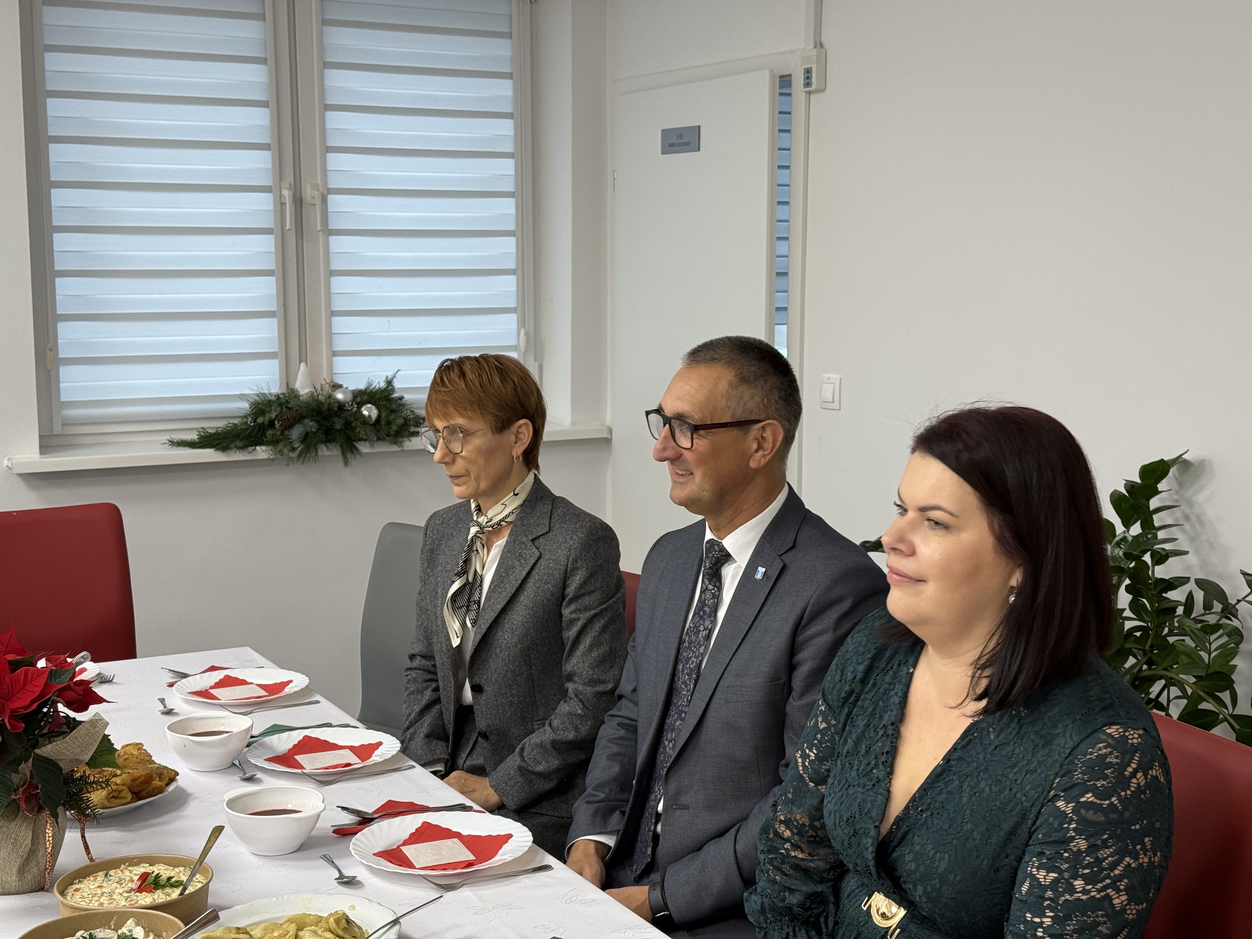Po części oficjalnej nadszedł czas na najważniejsze wigilijne momenty: łamanie się opłatkiem, wzajemne życzenia oraz wspólne kolędowanie. Sala szybko wypełniła się dźwiękami znanych melodii, które wprowadziły wszystkich w prawdziwie świąteczny nastrój. Wśród uczestników panowała serdeczność i radość.