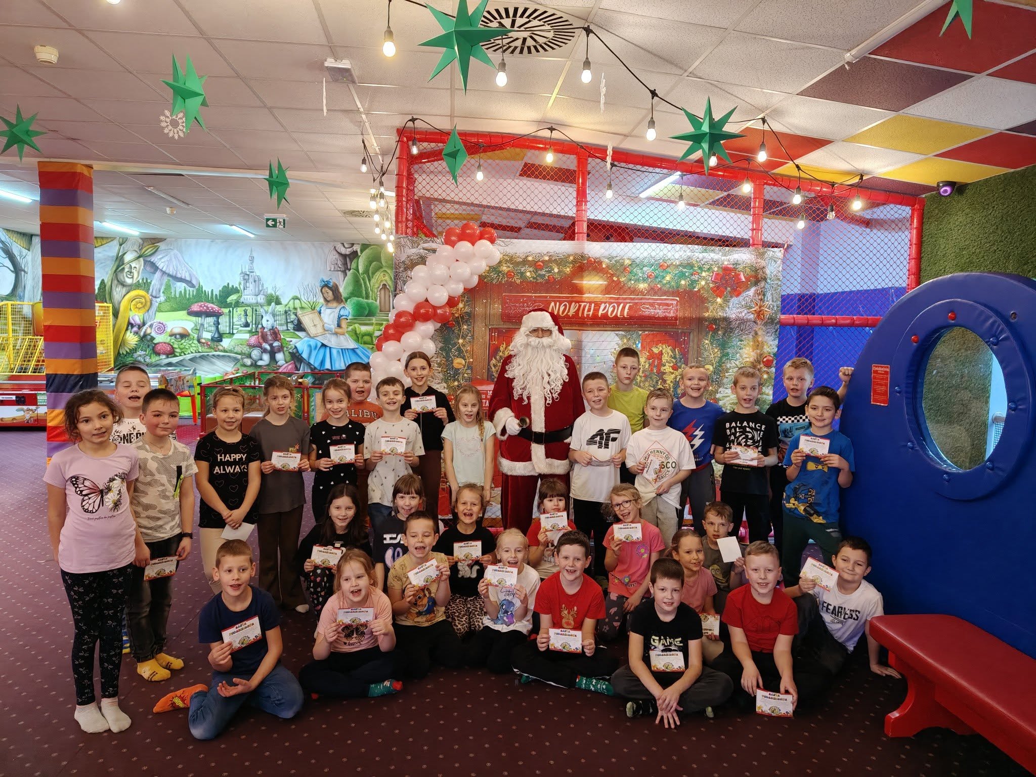 Pierwszym punktem wyjazdu była sala zabaw WMB, gdzie na najmłodszych czekało spotkanie z Mikołajem. Dzieci mogły korzystać z licznych atrakcji, brać udział w mikołajkowych animacjach oraz aktywnie spędzać czas w gronie rówieśników. Wspólna zabawa sprzyjała integracji, a uśmiechy na twarzach uczestników były najlepszym dowodem na to, jak wiele radości przyniosło to wydarzenie.