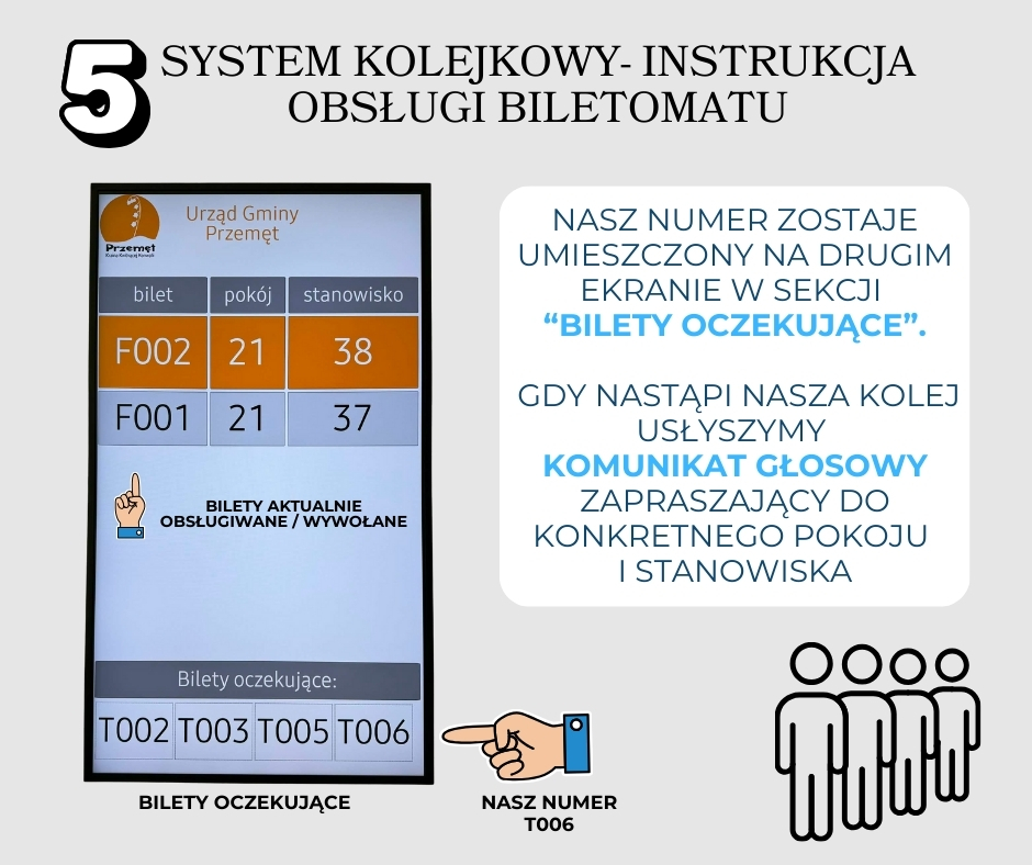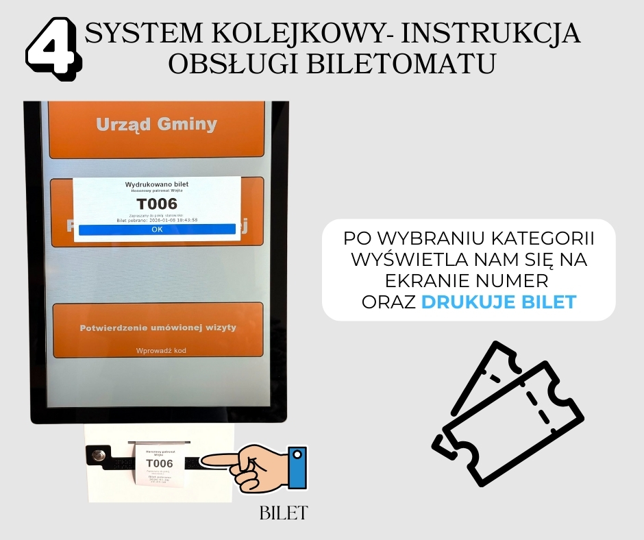 Po przyjściu do urzędu podchodzimy do biletomatu i wybieramy na dotykowym ekranie właściwy wydział oraz kategorię sprawy, którą chcemy zrealizować. Po otrzymaniu właściwego biletu oczekujemy na komunikat głosowy zapraszający do konkretnego pokoju i stanowiska. Należy pamiętać, że jedna sprawa przypisana jest do jednego biletu. W razie potrzeby załatwienia kilku spraw należy pobrać odpowiednią dla nich ilość biletów.