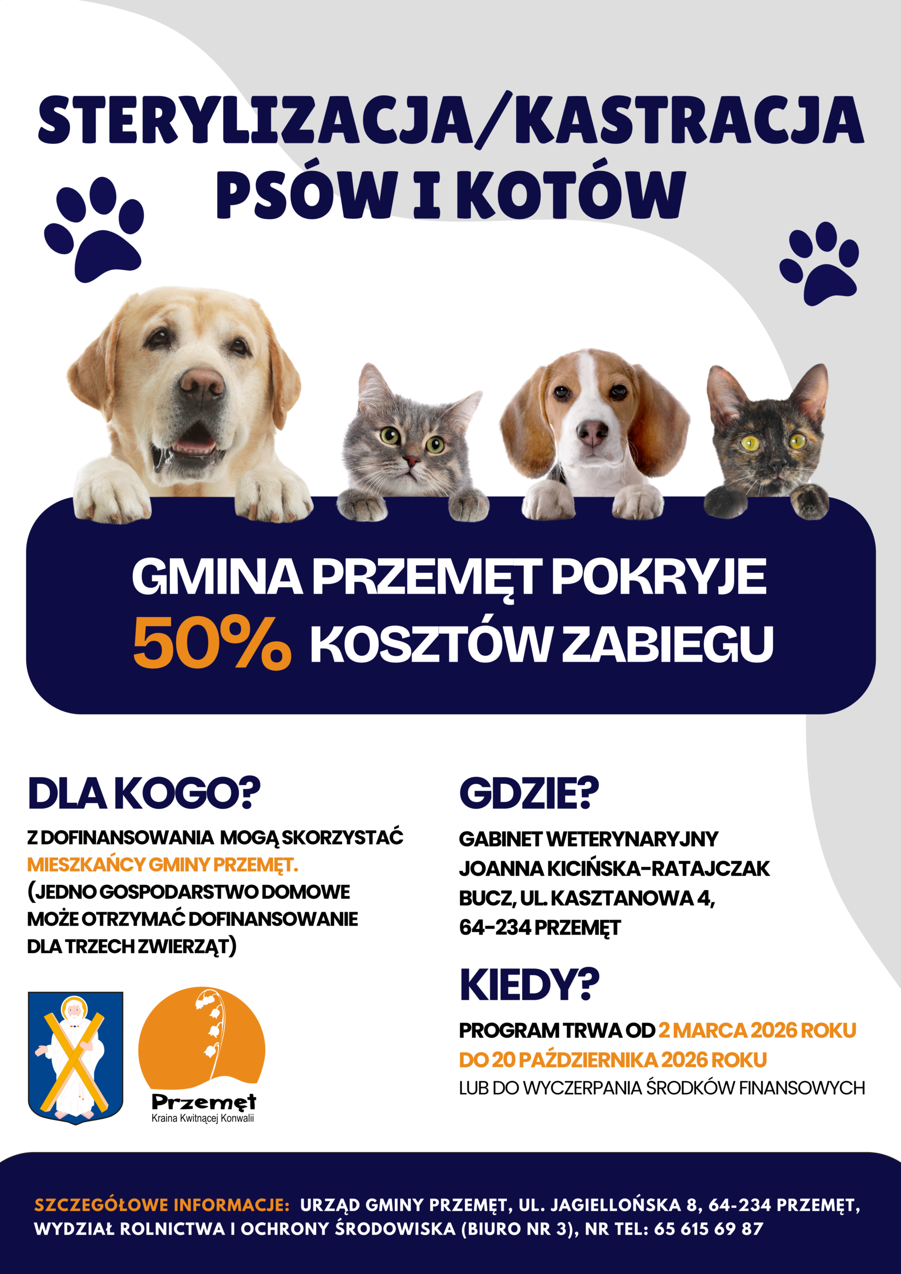 Wójt Gminy Przemęt informuje, iż z dniem 2 marca 2026 roku rozpoczyna się nabór wniosków o dofinansowanie na zabieg/zabiegi sterylizacji/kastracji psów i kotów. Dofinansowanie przysługuje właścicielom ww. zwierząt w wysokości 50 % kosztów zabiegu. W ramach programu mieszkańcy gminy mogą w roku 2026 na pisemny wniosek, zgłosić do Urzędu Gminy Przemęt, chęć sterylizacji lub kastracji do 3 szt. zwierząt, których są właścicielem lub opiekunem. Po weryfikacji właściciel zwierzęcia otrzyma skierowanie do lecznicy weterynaryjnej na sterylizację lub kastrację zwierzęcia.