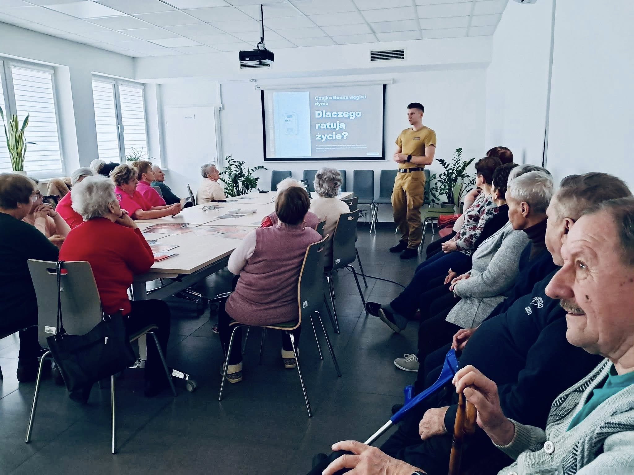 Strażacy przedstawili zasady bezpiecznego postępowania w codziennych sytuacjach, omówili najczęstsze przyczyny pożarów w domach oraz zaprezentowali działanie i sposób obsługi czujek. Uczestnicy mieli okazję z bliska przyjrzeć się urządzeniom, poznać ich zastosowanie oraz dowiedzieć się, gdzie najlepiej je montować. Nie zabrakło również czasu na pytania – seniorzy chętnie dzielili się swoimi doświadczeniami i wątpliwościami, a prowadzący udzielali szczegółowych odpowiedzi.