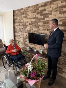 Podczas wizyty jubilatce wręczono list gratulacyjny oraz kosz kwiatów, dołączając najserdeczniejsze życzenia zdrowia, spokoju i wielu radosnych chwil. Spotkanie przebiegło w niezwykle ciepłej i serdecznej atmosferze, podkreślając, jak ważna jest pamięć o najstarszych mieszkańcach naszej gminy.