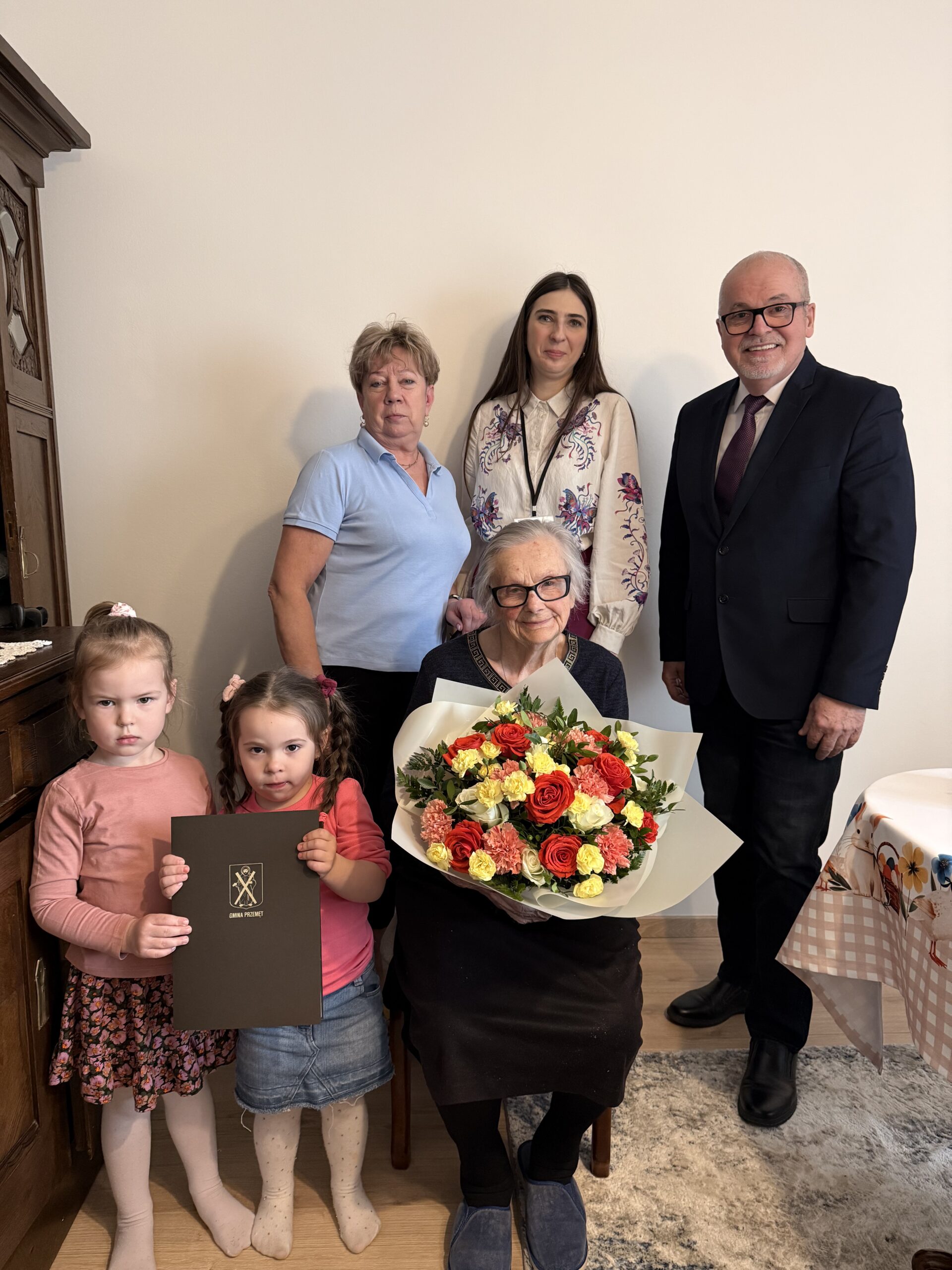 Następnie kierownik udał się do Perkowa, gdzie odwiedził panią Irenę Jędrzychowską, która w tym roku obchodzi 94. urodziny. Jubilatka również może poszczycić się liczną rodziną – troje dzieci, sześcioro wnuków oraz czworo prawnuków to jej największy skarb. Przez wiele lat prowadziła gospodarstwo rolne, co wiązało się z dużym zaangażowaniem i codzienną pracą. W wolnych chwilach znajdowała jednak czas na swoje zainteresowania – szczególnie lubiła czytać książki oraz zajmować się ogrodem. Obecnie z zainteresowaniem śledzi wydarzenia, oglądając programy telewizyjne i pozostając na bieżąco z tym, co dzieje się w kraju i na świecie.