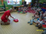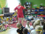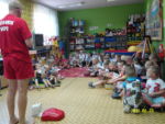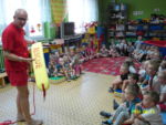 Mieliśmy okazję zaprosić do naszego przedszkola ratownika WOPR-u Kościan pana Jarosława Smoczyka. Ratownik szczegółowo przedstawił dzieciom jak powinniśmy reagować podczas sytuacji zagrożenia zdrowia i życia. Kolejny raz wychowankowie przedszkola zostali uwrażliwieni na numery alarmowe oraz na konieczność udzielenia pomocy osobie poszkodowanej. Wiedza i świadomość pozyskana podczas wczesnej edukacja w zakresie bezpieczeństwa i pierwszej pomocy pozwali uniknąć wiele wypadków i zdarzeń, a dodatkowo kształtuje właściwe postawy i zachowania podczas sytuacji zagrożenia życia. Profesjonalna postawa ratownika sprawiła, że wszystkie dzieci i pracownicy z uwagą i w ogromnym skupieniu przysłuchiwali się prelekcji. Mamy nadzieję, że wiedza nabyta przez naszych wychowanków sprawi, że dojrzale i świadomie będą unikać sytuacji zagrażających zdrowiu i życiu szczególnie podczas wakacji.