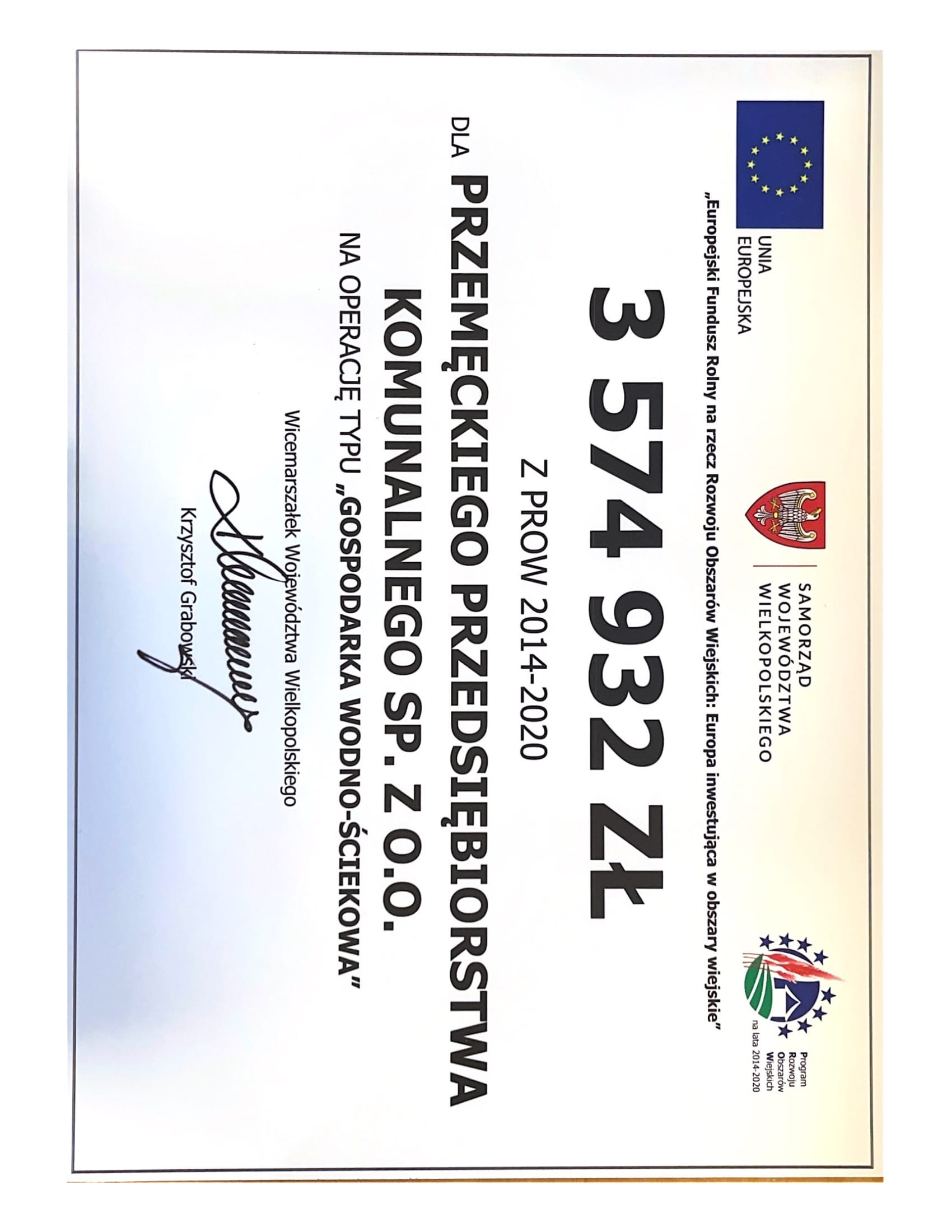 Na powyższe zadanie PPK w Przemęcie, Uchwałą Nr 5849/2022 z dnia 24 listopada 2022 r. Zarządu Województwa Wielkopolskiego otrzymało wsparcie finansowe dla operacji typu „Gospodarka wodno-ściekowa” w ramach poddziałania „Wsparcie inwestycji związanych z tworzeniem, ulepszaniem lub rozbudową wszystkich rodzajów małej infrastruktury, w tym inwestycji w energię odnawialną i w oszczędzanie energii” objętego Programem Rozwoju Obszarów Wiejskich na lata 2014-2020,  finansowanych  ze środków Instrumentu Unii Europejskiej na rzecz Odbudowy.