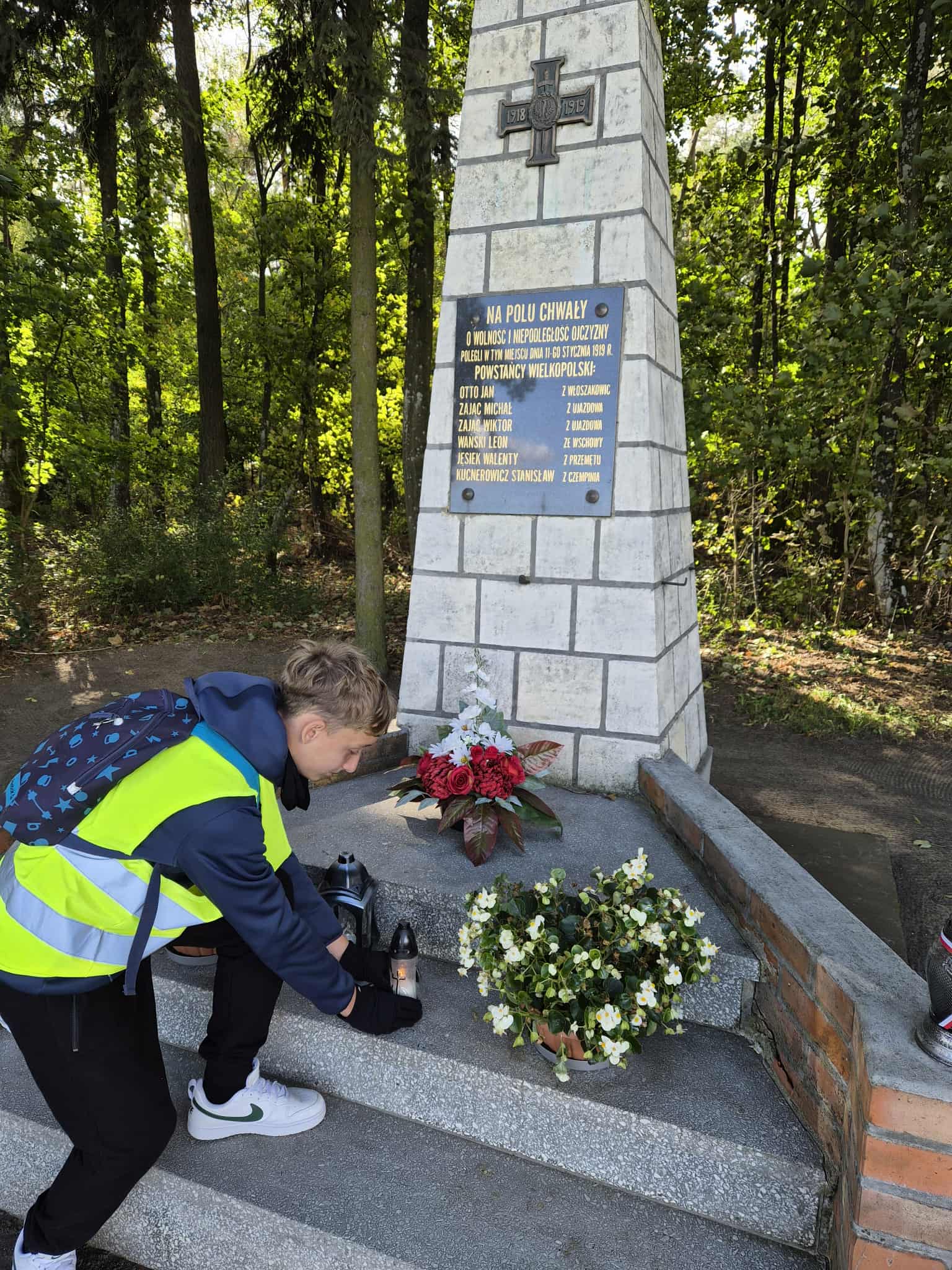 Kolejnym etapem było Zbarzewo, miejsce zwycięskiej potyczki Kompanii Przemęckiej z niemieckim oddziałem straży granicznej. Przy znajdującym się tam pomniku uczestnicy zapalili znicz i uczcili pamięć poległych minutą ciszy. Po historycznej części wyprawy przyszedł czas na relaks – droga leśna zaprowadziła rowerzystów do Domu Rekolekcyjnego w Zaborówcu, gdzie czekało na nich wiele atrakcji: sportowe rozgrywki, prelekcja o profilaktyce zdrowotnej oraz spotkanie z grupą rekonstrukcyjną „Tschuff” z Kościana. Rekonstruktorzy – Miłosz Kiciński, Wiktoria Stefanowska i Agata Cieślik – w ciekawy sposób wprowadzili młodzież w realia powstańczej codzienności, zachęcając do zadawania pytań i dyskusji. Dzień zakończyło wspólne ognisko i rozmowy o tym, jak ważne jest zachowanie pamięci o lokalnych bohaterach.