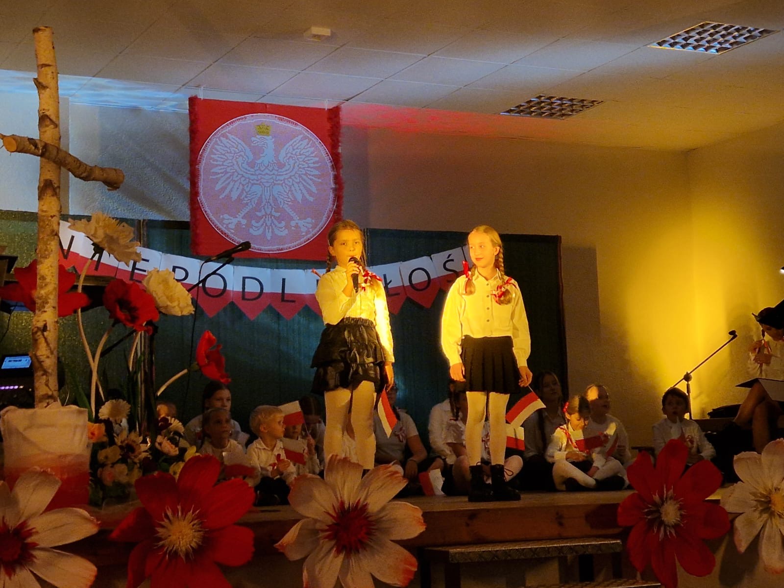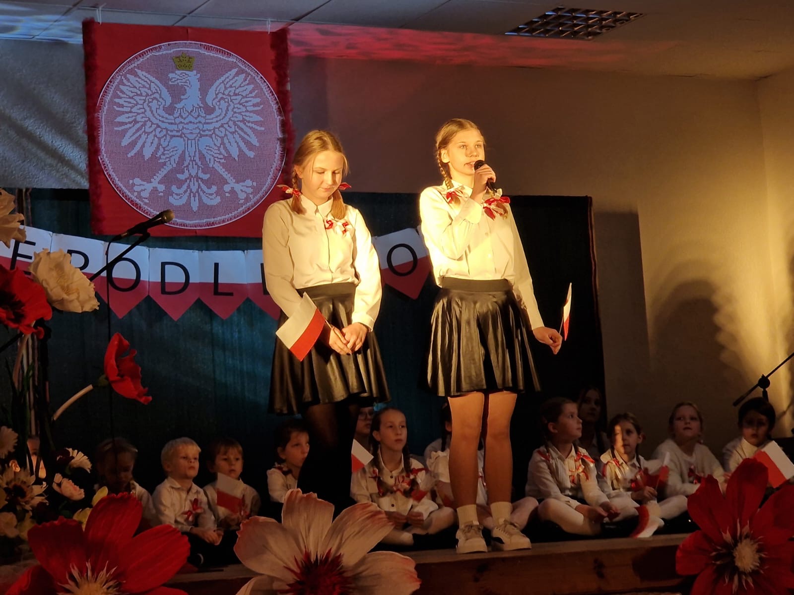 Na zdjęciu dwie dziewczyny podczas wystąpienia na scenie. Scena udekorowana jest w duże, sztuczne kwiaty koloru białego i czerwonego oraz widoczny jest napis "niepodległość". W tle widać inne osoby. Wszyscy trzymają w rękach małe flagi Polski na patyku.