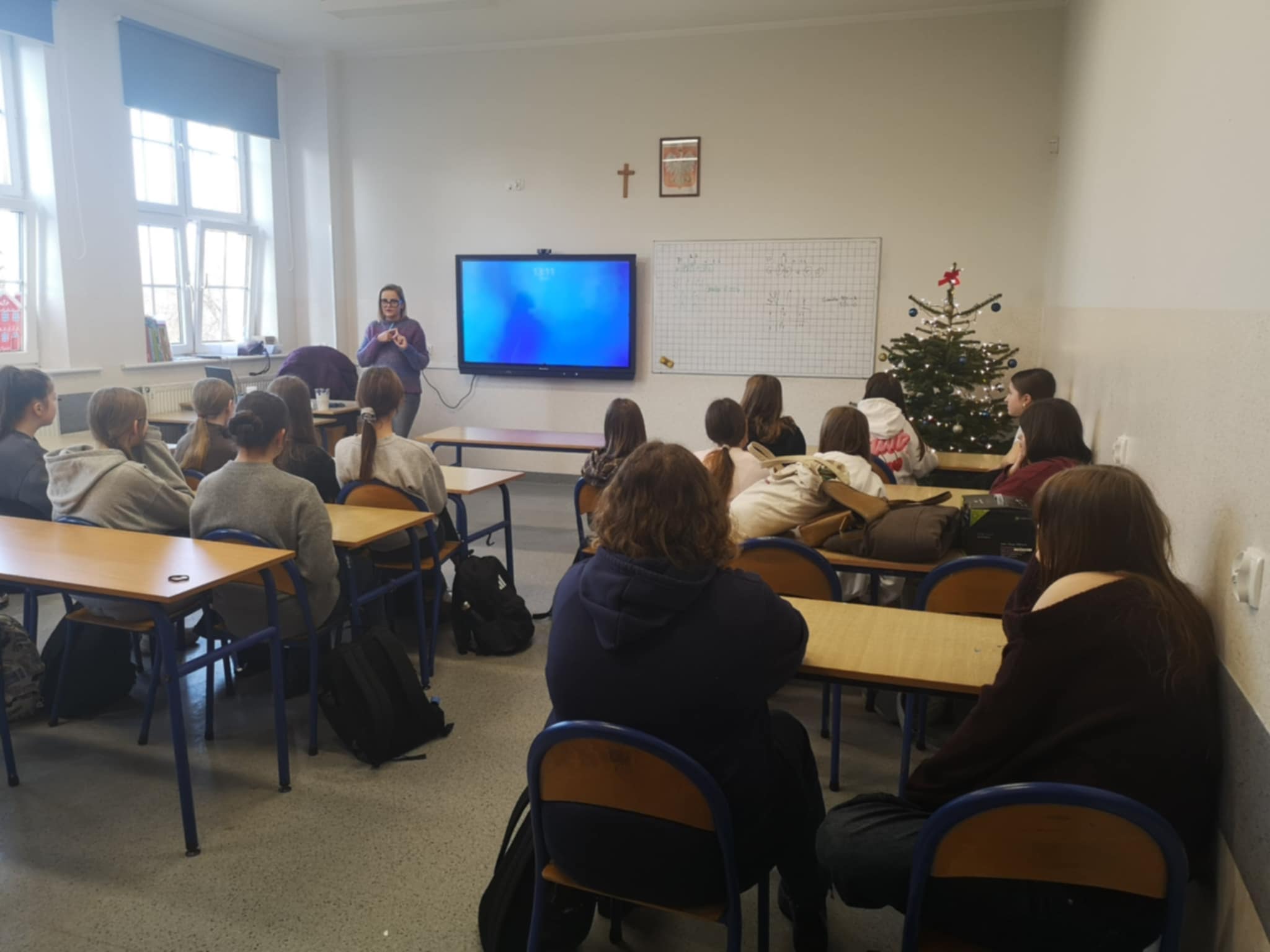 3 grudnia uczennice klas VII i VIII uczestniczyły w spotkaniu z dietetykiem, panią Anetą Tomczak-Gorzelniak. Zajęcia podzielone były na część poświęconą doradztwu zawodowemu oraz edukacji zdrowotnej. Prelegentka opowiedziała o swojej drodze zawodowej i możliwościach kształcenia w zawodzie dietetyka, a następnie przybliżyła zasady racjonalnego żywienia. Ważnym elementem spotkania była rozmowa o zaburzeniach odżywiania, ich przyczynach oraz konsekwencjach, szczególnie w kontekście relacji rówieśniczych i emocji towarzyszących dorastaniu.