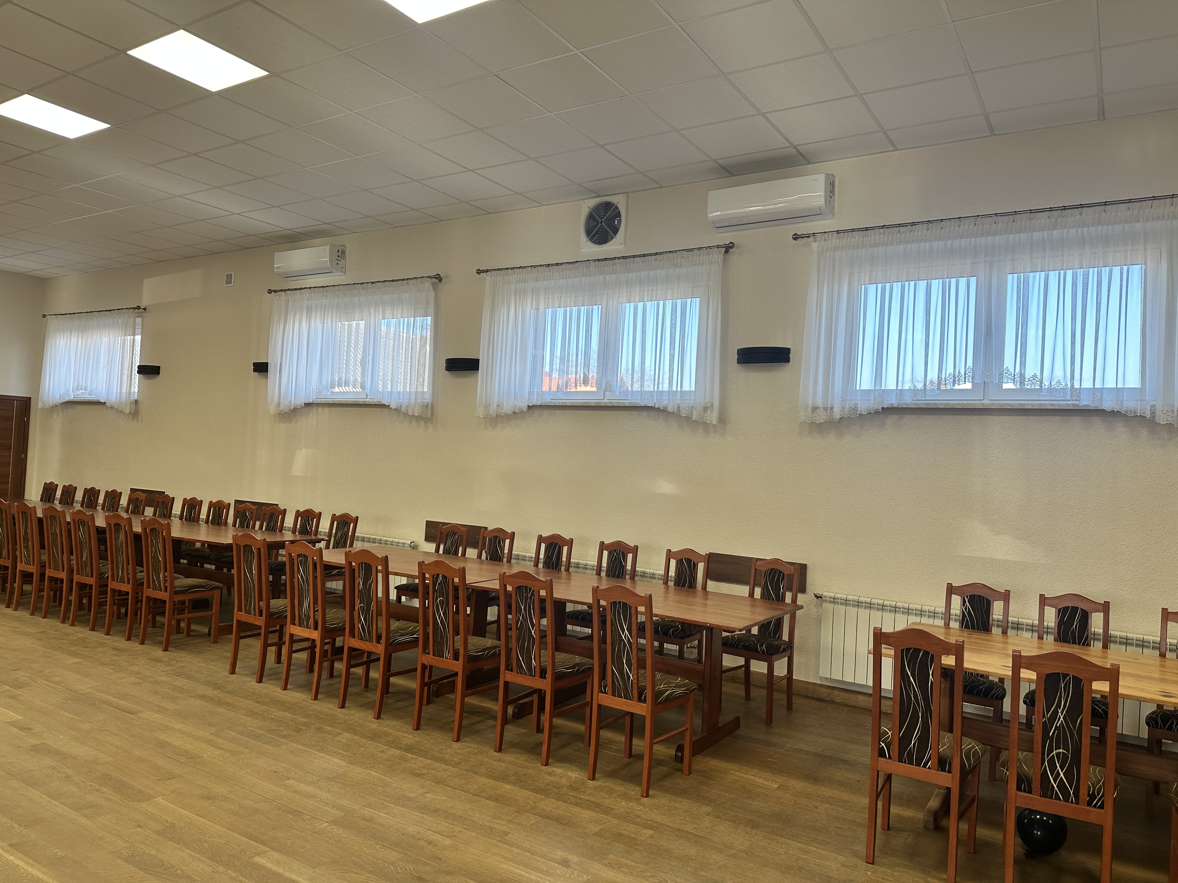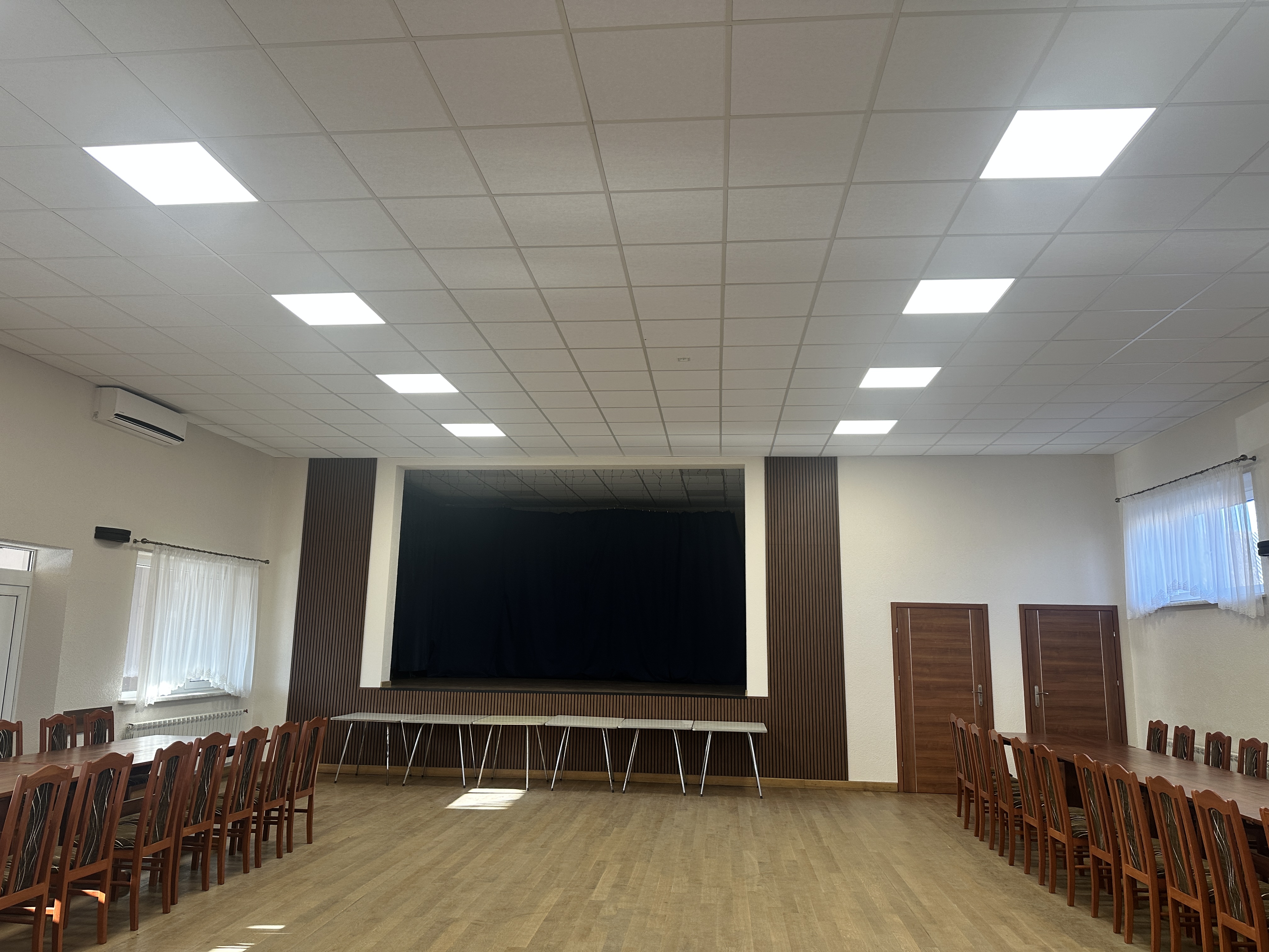 Zakres prac był szeroki i obejmował malowanie pomieszczeń sali wiejskiej – sali głównej, sceny, pomieszczenia gospodarczego oraz małej salki. W ramach inwestycji zabezpieczono podłogi, zdemontowano stare płyty z włókna mineralnego i zamontowano nowe, przygotowano oraz zagruntowano powierzchnie ścian, wykonano dwukrotne malowanie podłoży gipsowych, a także tapetowanie natryskowe farbą emulsyjną. Dodatkowo zamontowano nowe lampy, wykonano klejenie lameli i luster, a także zakupiono i zamontowano dwa nowe klimatyzatory.
