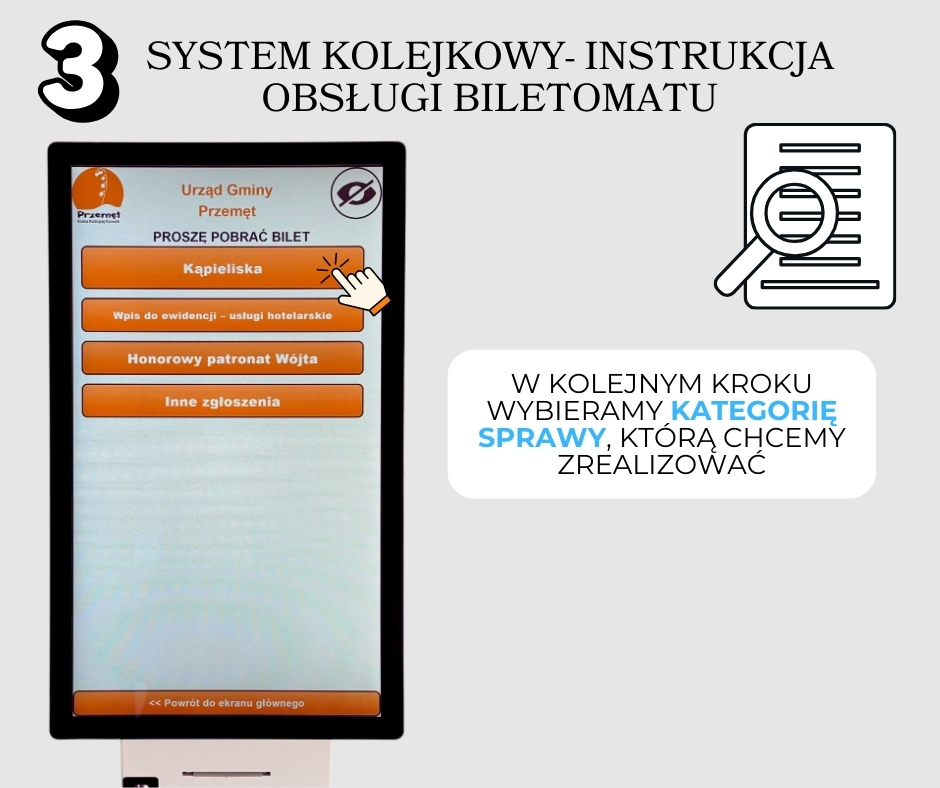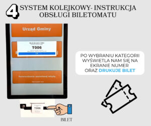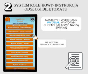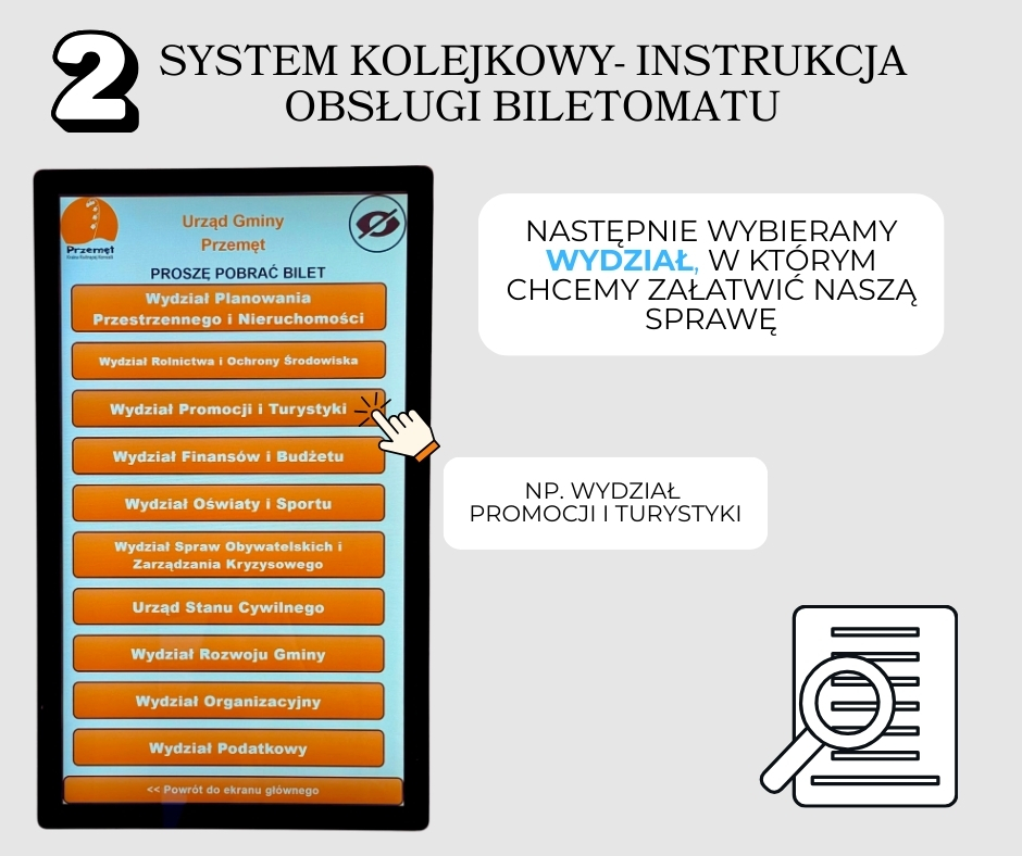Po przyjściu do urzędu podchodzimy do biletomatu i wybieramy na dotykowym ekranie właściwy wydział oraz kategorię sprawy, którą chcemy zrealizować. Po otrzymaniu właściwego biletu oczekujemy na komunikat głosowy zapraszający do konkretnego pokoju i stanowiska. Należy pamiętać, że jedna sprawa przypisana jest do jednego biletu. W razie potrzeby załatwienia kilku spraw należy pobrać odpowiednią dla nich ilość biletów.
