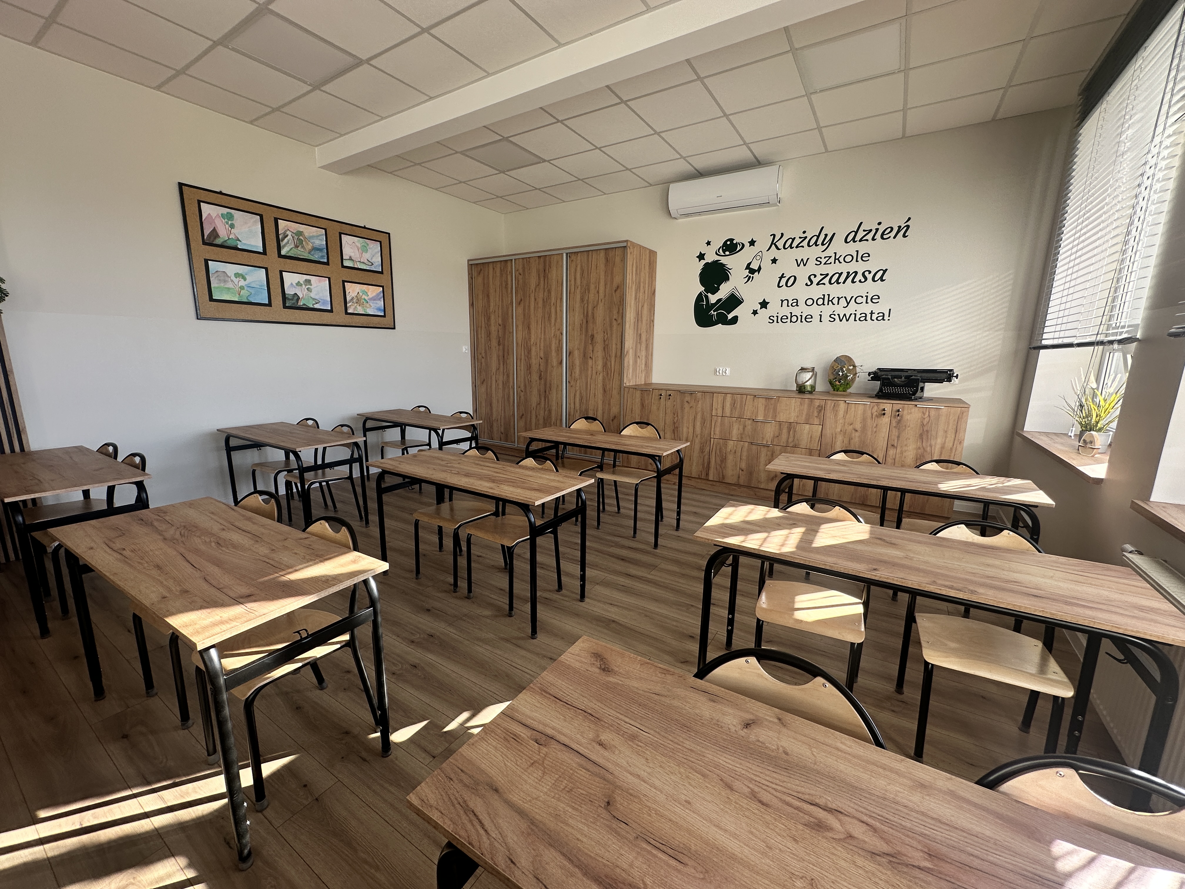 Sala lekcyjna nr 7 przeszła kompleksowy remont, którego koszt wyniósł 55.154,88 zł. Odnowione zostały ściany i podłoga, a pomieszczenie wyposażono w nowe elementy, które podnoszą funkcjonalność i estetykę wnętrza. Dzięki temu uczniowie mogą korzystać z przestrzeni dostosowanej do współczesnych standardów edukacyjnych, co sprzyja zarówno nauce, jak i codziennej pracy nauczycieli.