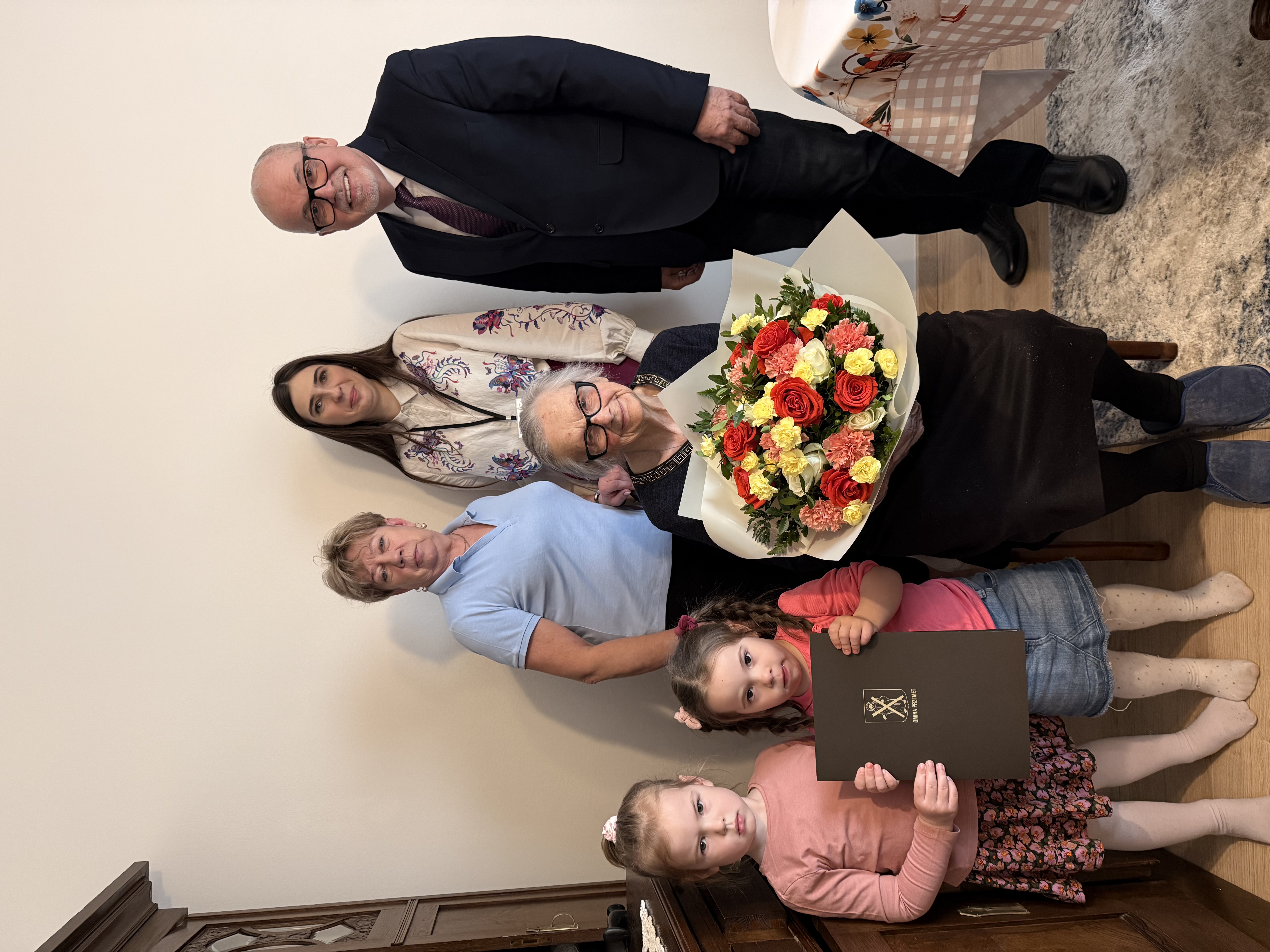 Następnie kierownik udał się do Perkowa, gdzie odwiedził panią Irenę Jędrzychowską, która w tym roku obchodzi 94. urodziny. Jubilatka również może poszczycić się liczną rodziną – troje dzieci, sześcioro wnuków oraz czworo prawnuków to jej największy skarb. Przez wiele lat prowadziła gospodarstwo rolne, co wiązało się z dużym zaangażowaniem i codzienną pracą. W wolnych chwilach znajdowała jednak czas na swoje zainteresowania – szczególnie lubiła czytać książki oraz zajmować się ogrodem. Obecnie z zainteresowaniem śledzi wydarzenia, oglądając programy telewizyjne i pozostając na bieżąco z tym, co dzieje się w kraju i na świecie.