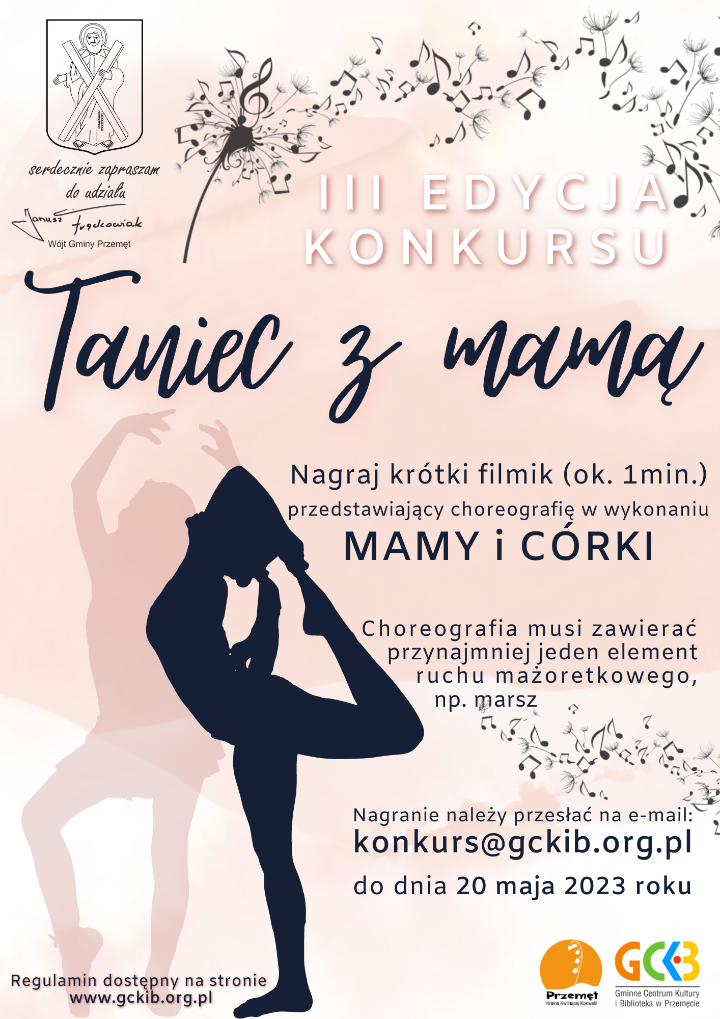 Regulamin udziału: https://gckib.org.pl/wp-content/uploads/2023/04/gckib.org.pl-regulamin-konkursu-taniec-z-mama-iii-edycja.pdf