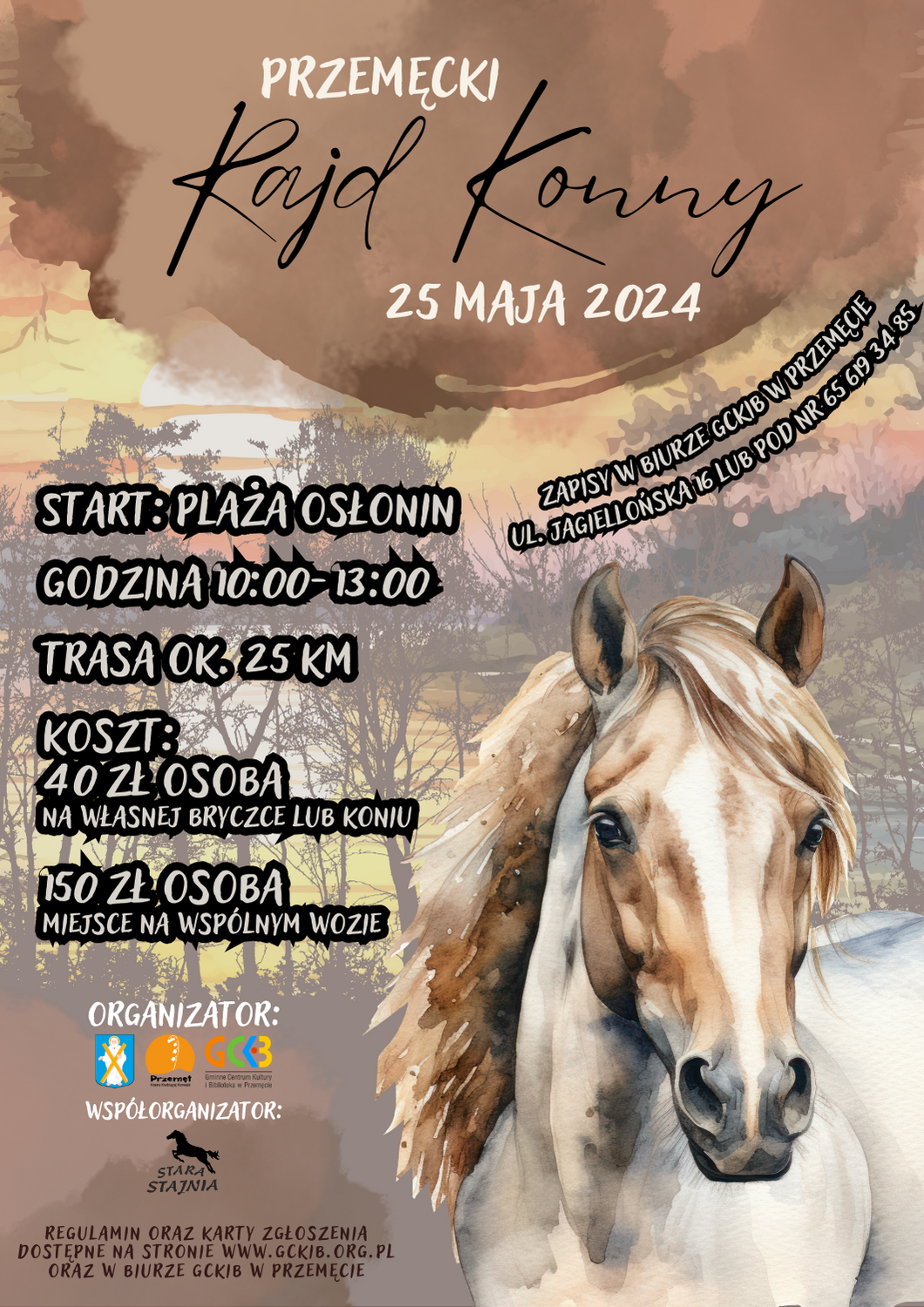 Po kilku latach wracamy! Dołącz do nas podczas rajdu konnego, który odbędzie się 25 maja 2024 roku! Ruszymy w 25 kilometrową trasę, przemierzając malownicze tereny gminy Przemęt.